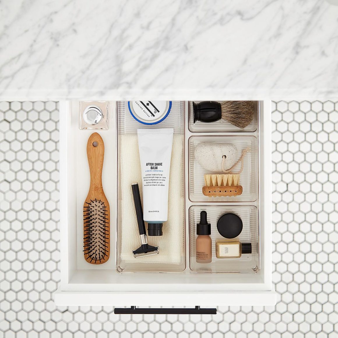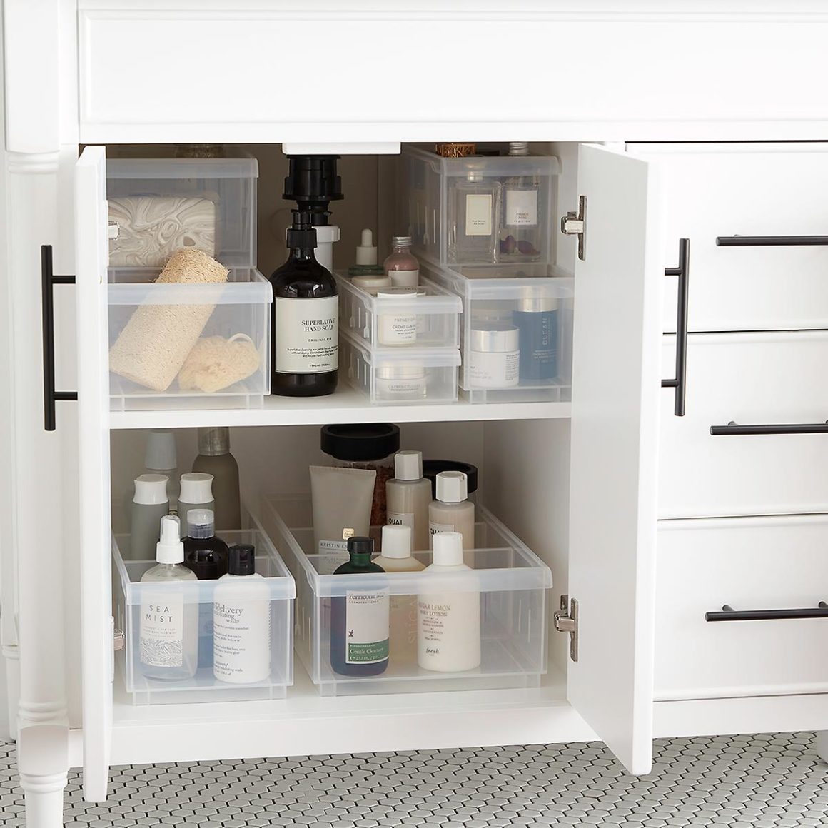If your bathroom has a vanity, use creative storage solutions to keep your bathroom essentials organized. Under the sink, opt for stacking bins that will help keep everything in its place and easy to find. If your vanity has drawers you can also leverage trays to keep everything from becoming a mess.