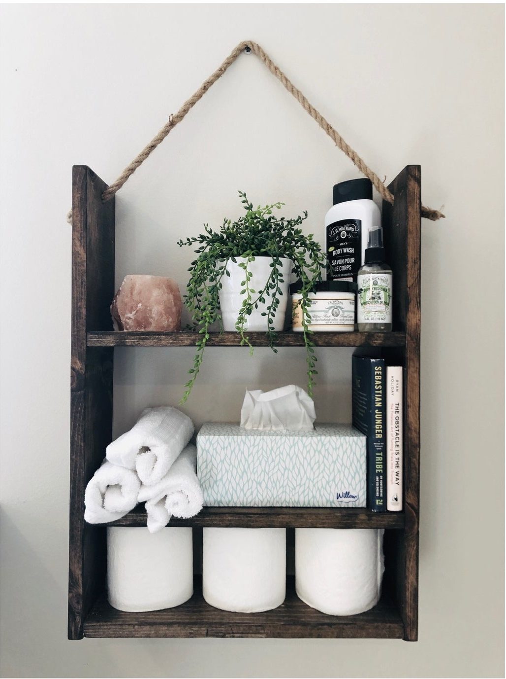 Repurposed crates or wire baskets are also pretty unique. They are perfect for holding toilet paper or towels. Hanging baskets, in general, give easy access to all of your bathroom necessities and provide plenty of storage.